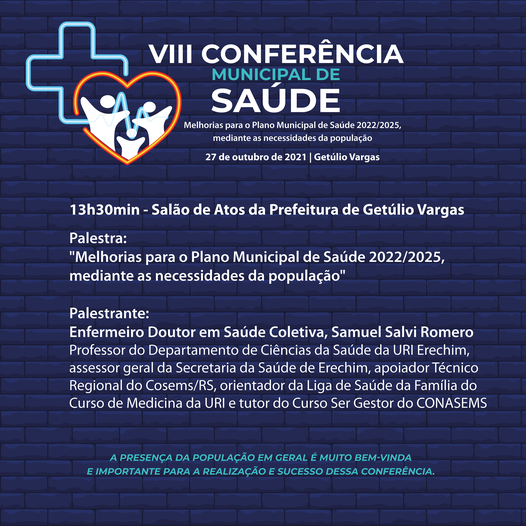 O evento acontecerá às 13h30, no Salão de Atos da Prefeitura de Getúlio Vargas, com a palestra Melhorias para o Plano Municipal da Saúde 2022/2025, Mediante Necessidade da População.