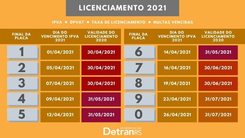 Será considerado licenciado para 2021 e apto a circular o veículo que tiver quitados todos os débitos de IPVA, taxa do DetranRS e eventuais multas vencidas. O valor do seguro DPVAT está zerado este ano.